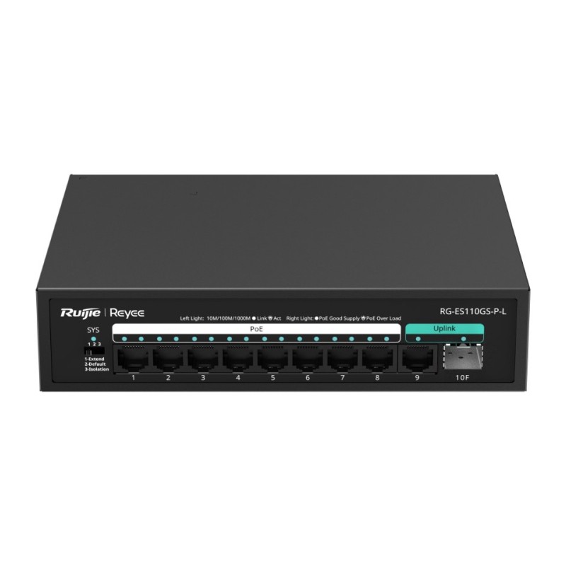 Ruijie Reyee Unmanaged Switch 8-Port 1000Mbps + 1 Uplink Port 1000Mbps + 1 Uplink SFP Port,8 ports for PoE/PoE+, Max PoE power budget is 120W, Steel Case RG-ES110GS-P-L