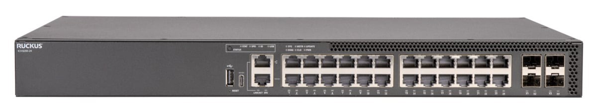 RUCKUS ICX 8200 Switch, 24?10/100/1000 Mbps ports, 4?25 GbE SFP28 stacking/uplink-ports, three-year remote support. Power cord not included.