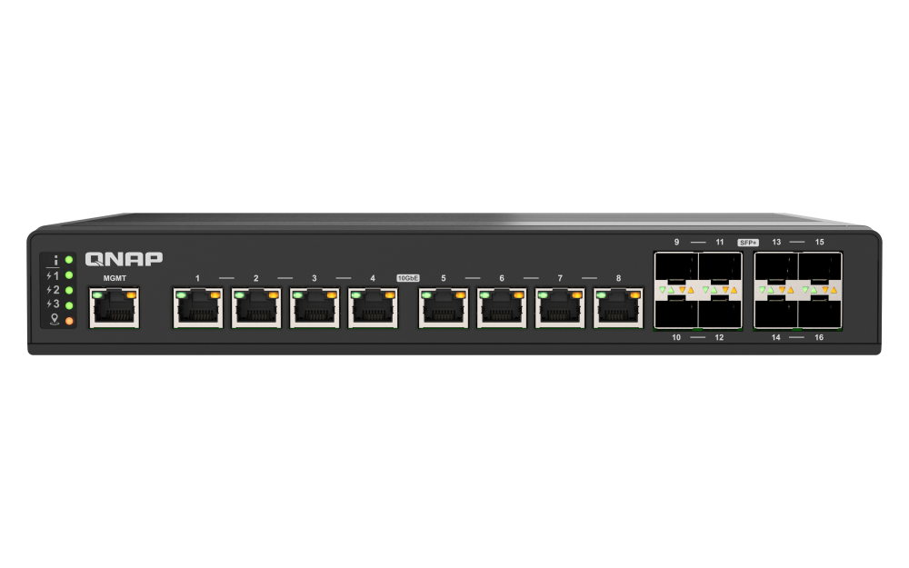 QNAP QSW-IM3216-8S8T, fan less industrial design, 8 ports 10GbE RJ45, 8 ports 10GbE SFP+, rack mount, wall mount web managed switch